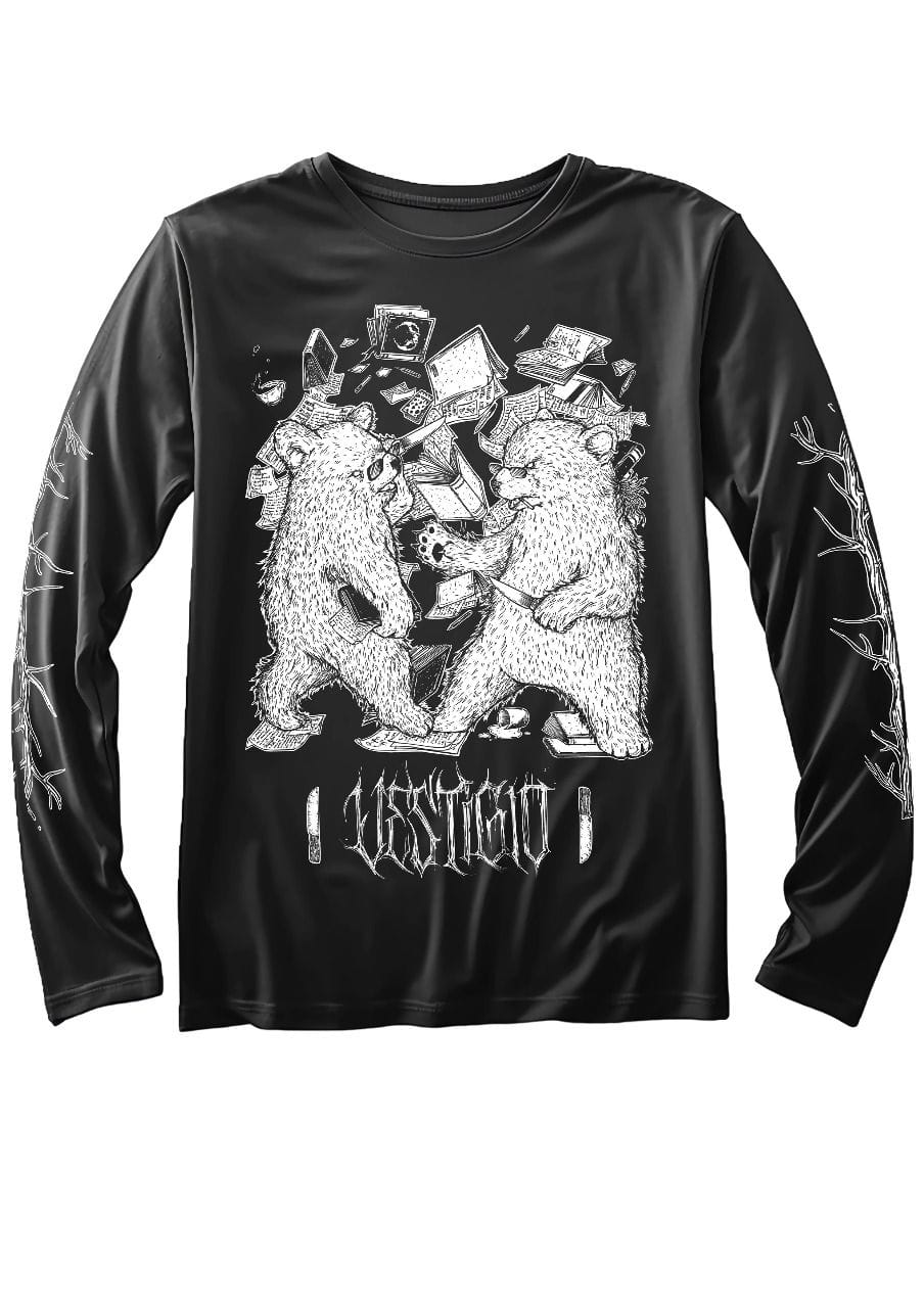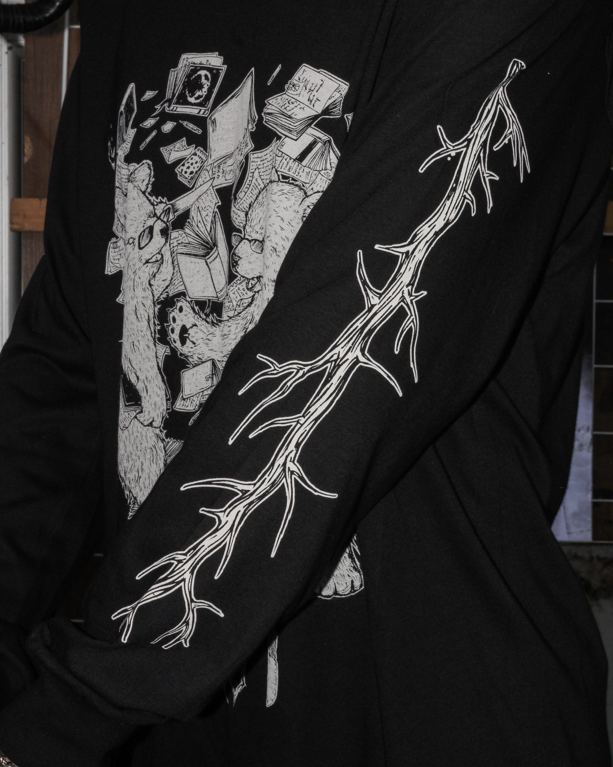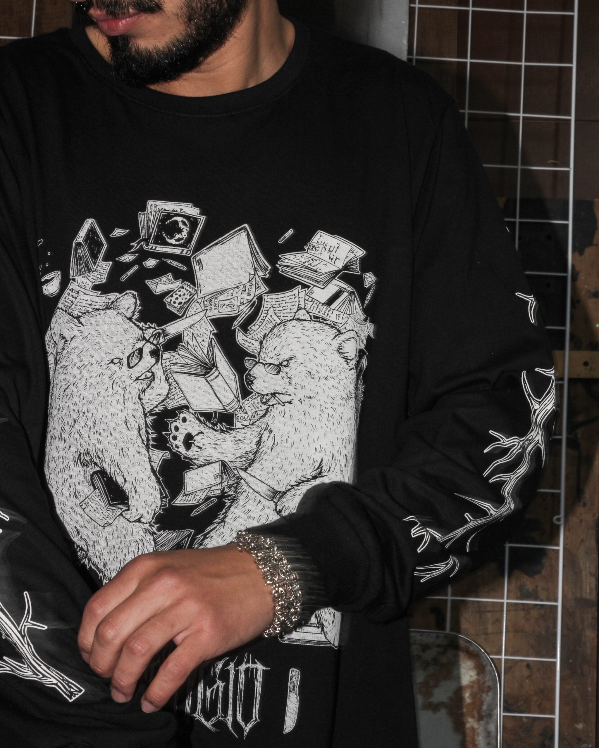 Las camisetas y camibusos son unisex, 100% algodón, con serigrafía hecha por Lxs Bandidxs Taller (@lxsbandidxstaller) de dos osos en duelo con cuchillos como diseño delantero. ¡La camiseta manga larga tiene además ramas en los brazos como diseño adicional!