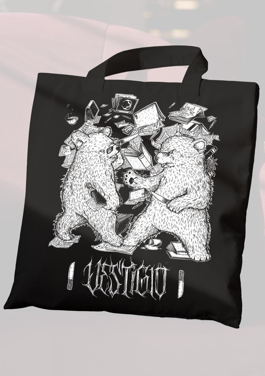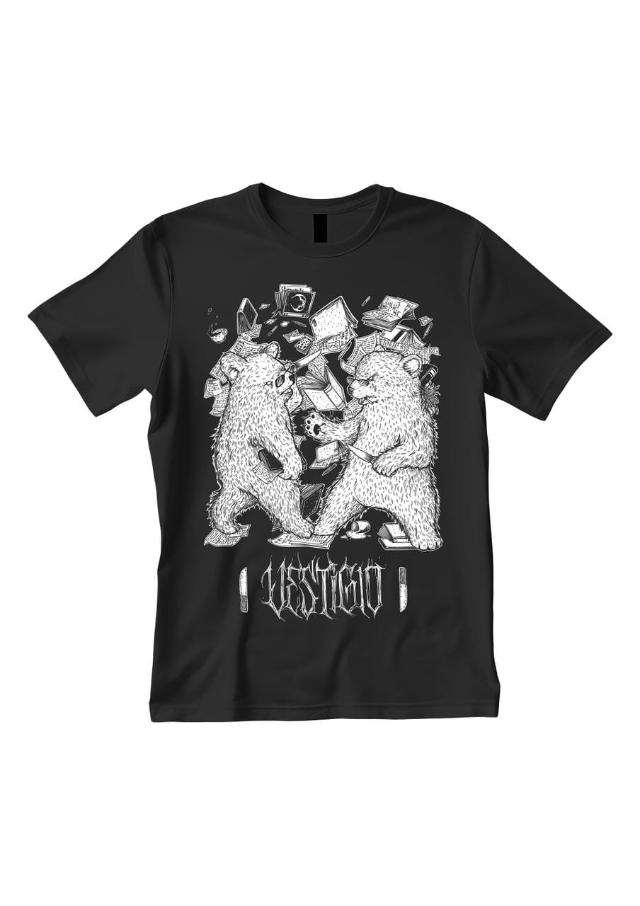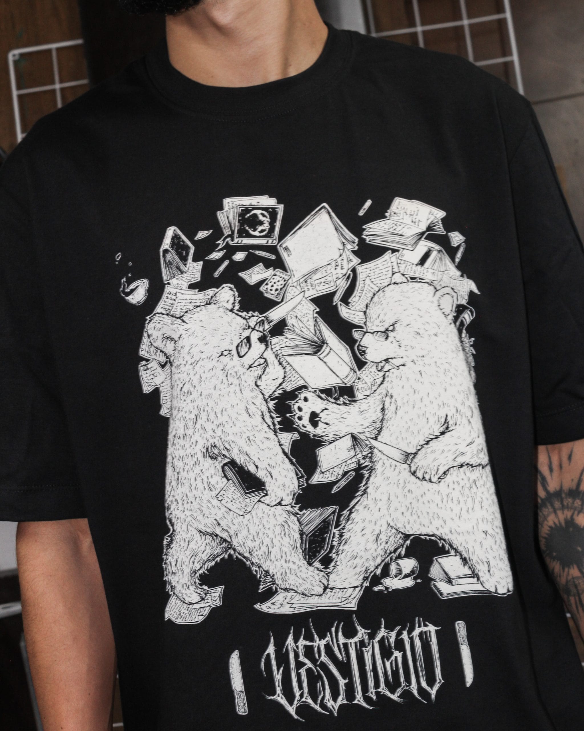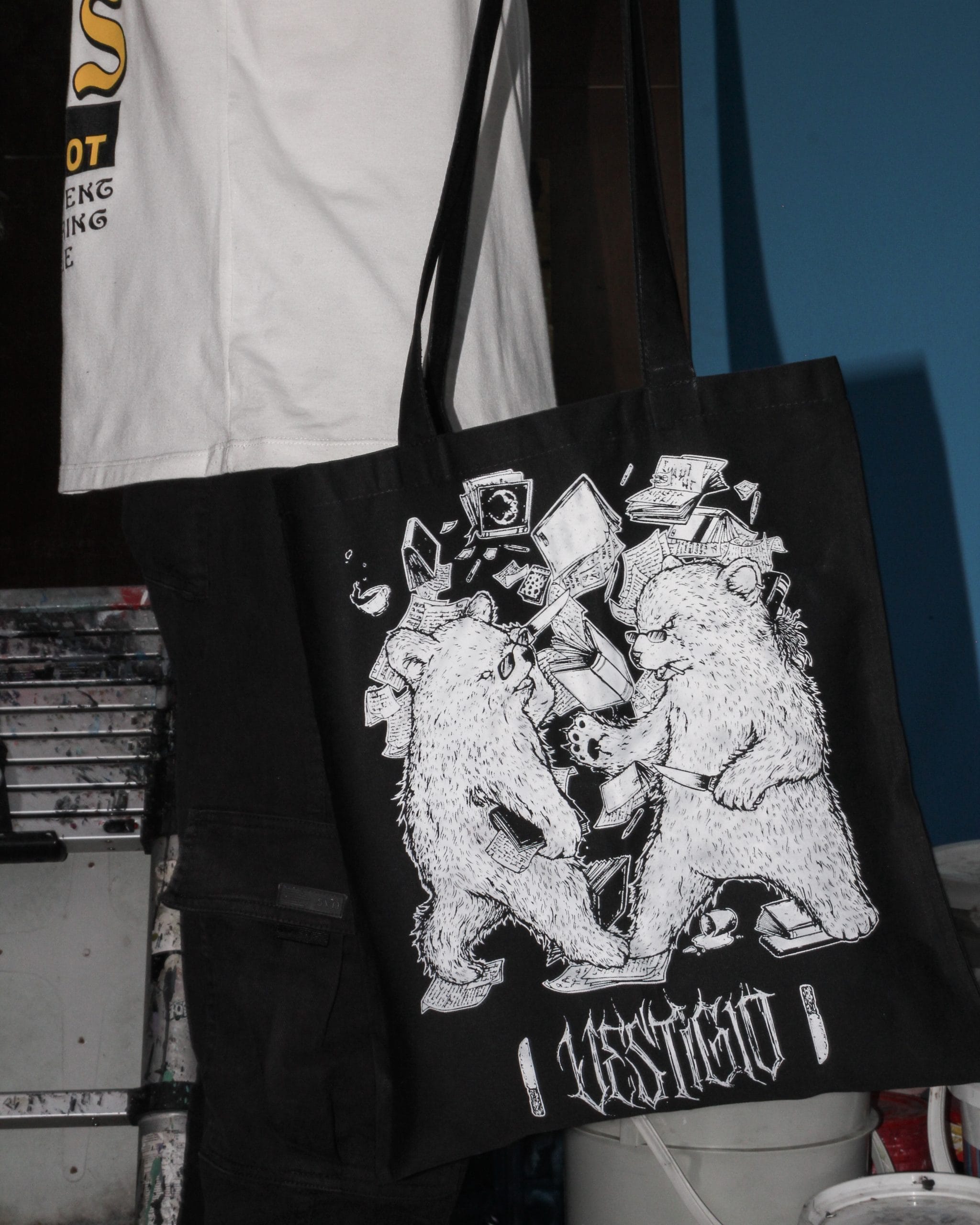 Las camisetas y camibusos son unisex, 100% algodón, con serigrafía hecha por Lxs Bandidxs Taller (@lxsbandidxstaller) de dos osos en duelo con cuchillos como diseño delantero. ¡La camiseta manga larga tiene además ramas en los brazos como diseño adicional!